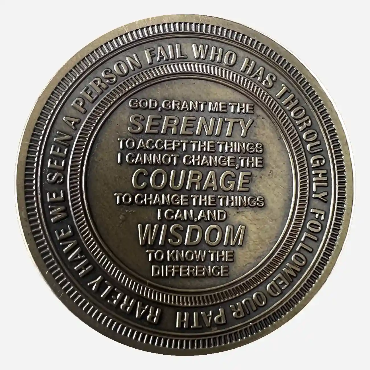 The Back: The full Serenity Prayer is engraved in raised lettering, offering serenity, courage, and wisdom every time you hold the coin.